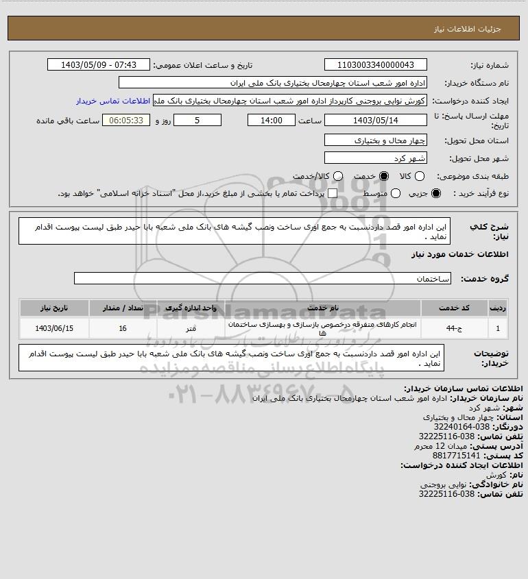 شرح کلی نیاز: این اداره امور قصد داردنسبت به جمع اوری ساخت ونصب گیشه های بانک ملی شعبه بابا حیدر طبق لیست پیوست اقدام نماید .
