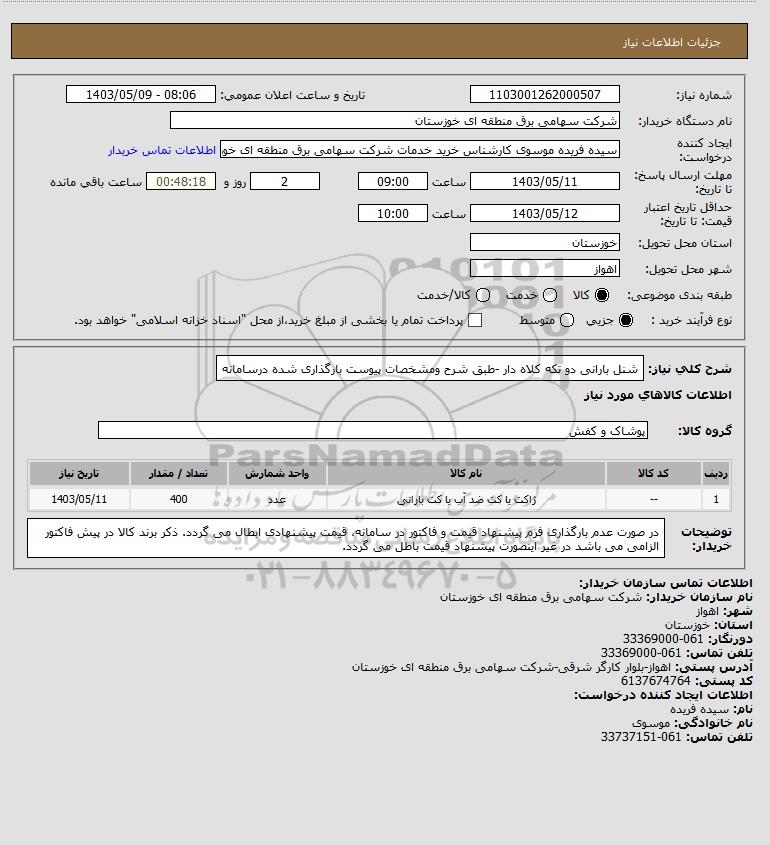 استعلام شنل بارانی دو تکه کلاه دار -طبق شرح ومشخصات پیوست بارگذاری شده درسامانه, استعلام شنل بارانی دو تکه کلاه دار -طبق شرح ومشخصات پیوست بارگذاری شده درسامانه