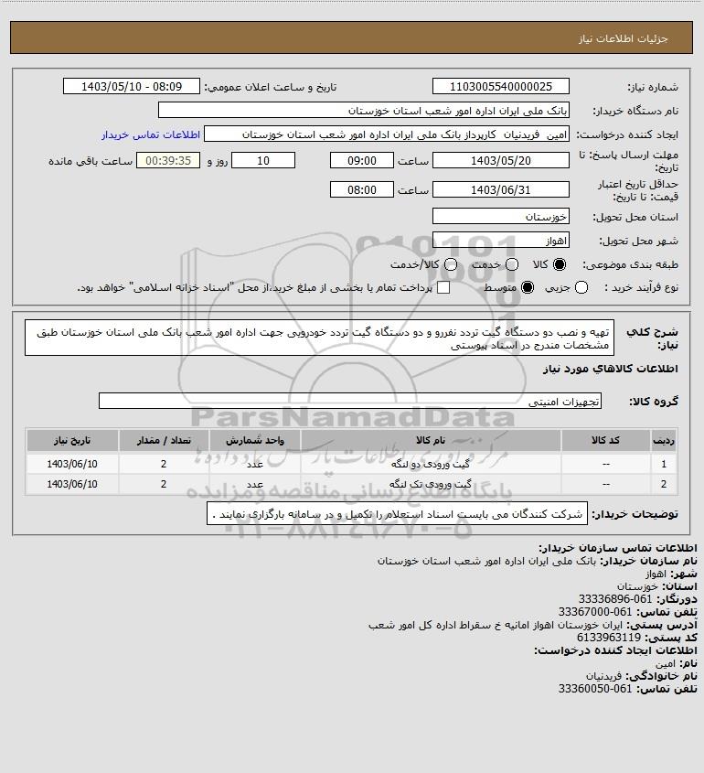 شرح کلی نیاز: تهیه و نصب دو دستگاه گیت تردد نفررو و دو دستگاه گیت تردد خودرویی جهت اداره امور شعب بانک ملی استان خوزستان طبق مشخصات مندرج در اسناد پیوستی
