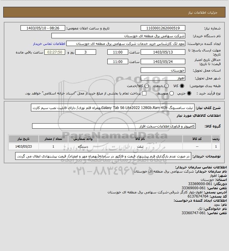 نام دستگاه خریدار:شرکت سهامی برق منطقه ای خوزستان