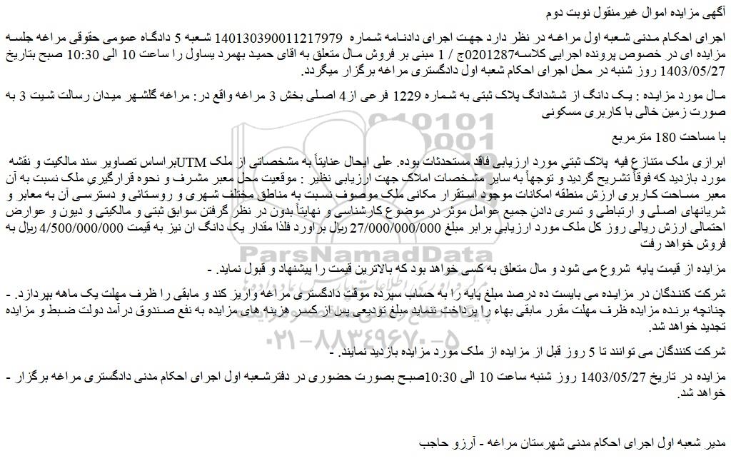 - مزایده در تاریخ 1403/05/27 روز شنبه ساعت 10 الی 10:30صبح بصورت حضوری در دفترشعبه اول اجرای احکام مدنی دادگستری مراغه برگزار خواهد شد.