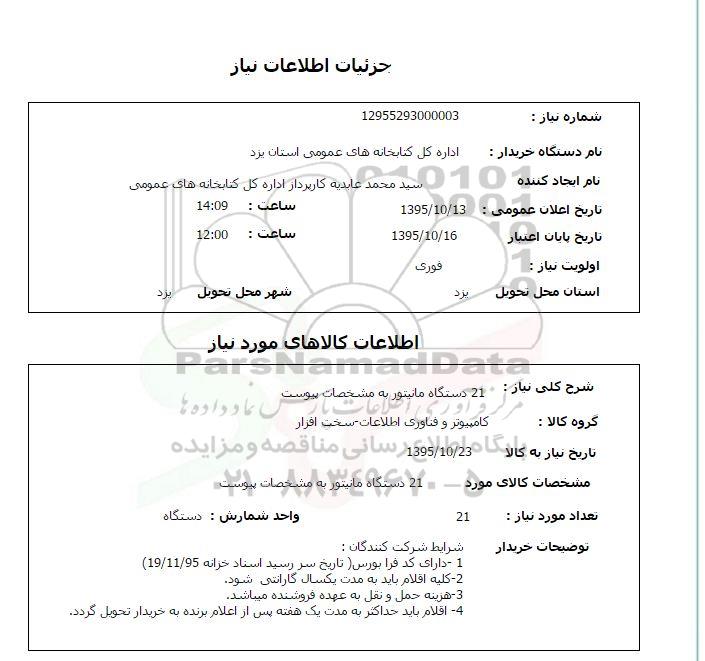شرح کلی نیاز : 21 دستگاه مانیتور به مشخصات پیوست
