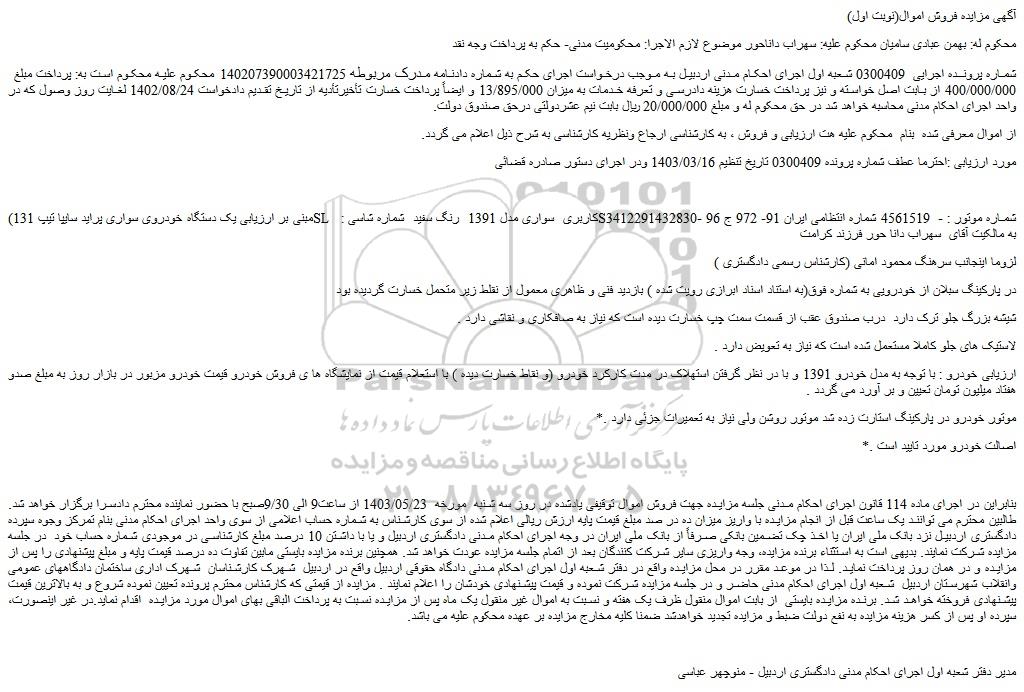 شماره پرونده اجرایی 0300409 شعبه اول اجرای احکام مدنی اردبیل به موجب درخواست اجرای حکم به شماره دادنامه مدرک مربوطه 140207390003421725 محکوم علیه محکوم است به: پرداخت مبلغ 400/000/000 از بابت اصل خواسته و نیز پرداخت خسارت هزینه دادرسی و تعرفه خدمات به میزان 13/895/000 و ایضاً پرداخت خسارت تأخیرتأدیه از تاریخ تقدیم دادخواست 1402/08/24 لغایت روز وصول که در واحد اجرای احکام مدنی محاسبه خواهد شد در حق محکوم له و مبلغ 20/000/000 ریال بابت نیم عشردولتی درحق صندوق دولت.