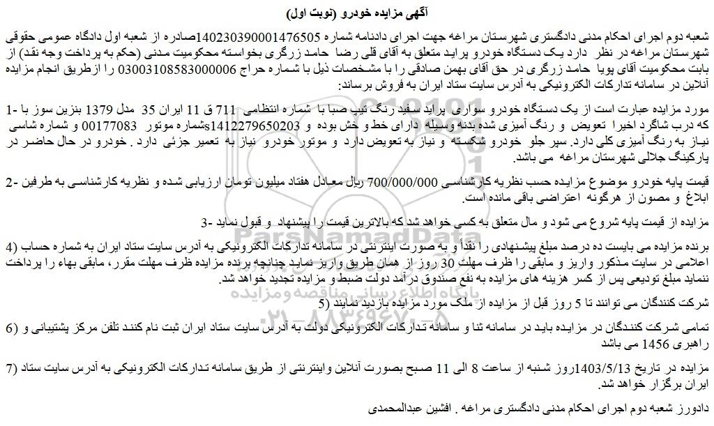شعبه دوم اجرای احکام مدنی دادگستری شهرستان مراغه جهت اجرای دادنامه شماره 140230390001476505صادره از شعبه اول دادگاه عمومی حقوقی شهرستان مراغه در نظر دارد یک دستگاه خودرو پراید متعلق به آقای قلی رضا حامد زرگری بخواسته محکومیت مدنی (حکم به پرداخت وجه نقد) از بابت محکومیت آقای پویا حامد زرگری در حق آقای بهمن صادقی را با مشخصات ذیل با شماره حراج 03003108583000006 را ازطریق انجام مزایده آنلاین در سامانه تدارکات الکترونیکی به آدرس سایت ستاد ایران به فروش برساند: