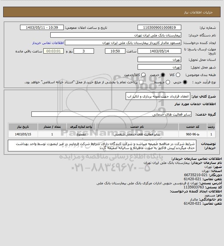 شرح کلی نیاز: انعقاد قرارداد جهت نمونه برداری و انالیز اب
