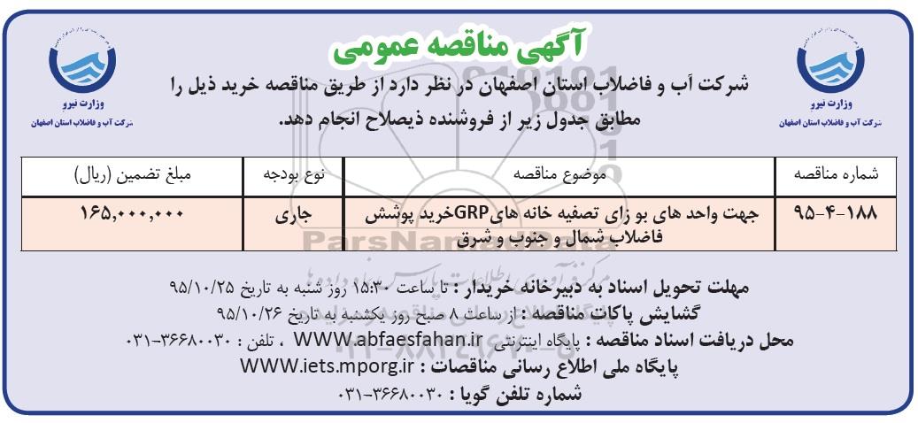 مناقصه خرید پوشش فاضلاب شمال و جنوب و شرق جهت واحدهای بو زای تصفیه خانه های GRP, آگهی مناقصه عمومی , مناقصه خرید پوشش فاضلاب شمال و جنوب و شرق جهت واحدهای بو زای تصفیه خانه های GRP