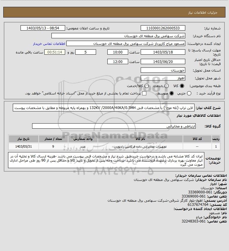 نام سازمان خریدار: شرکت سهامی برق منطقه ای خوزستان