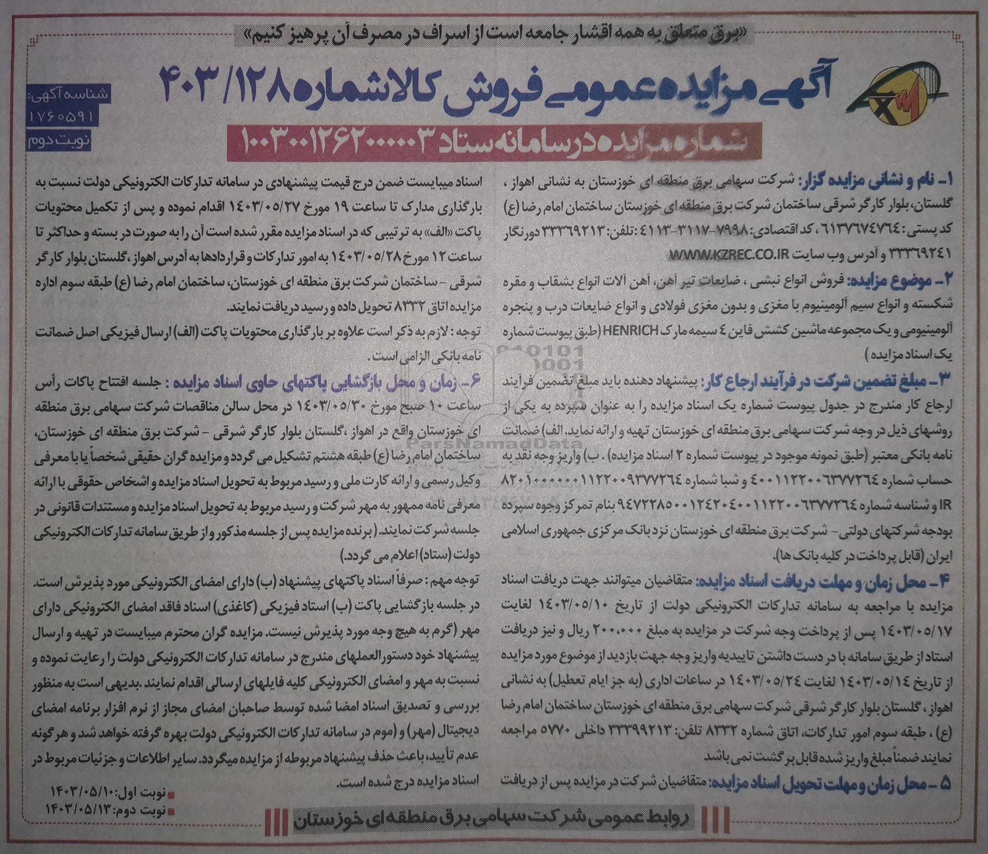 آگهی مزایده عمومی فروش کالا شماره 403/128؟