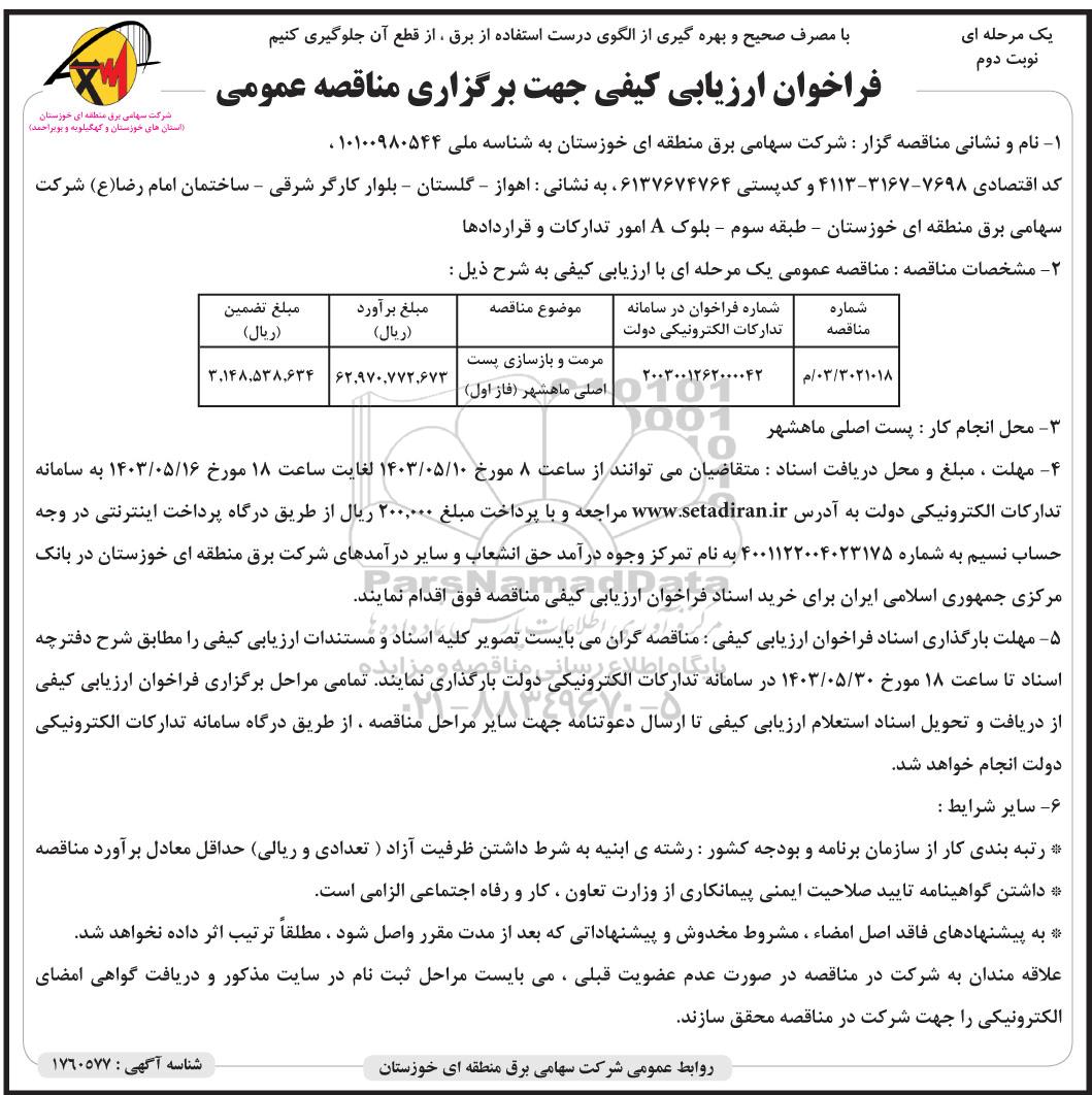 مناقصه مرمت و بازسازی پست اصلی ماهشهر (فاز اول) نوبت دوم از کلیه افراد متخصص و شرکتها واجد شرایط دعوت به عمل میآید در مناقصه با کد خبرگزاری پارس نماد: 7812198 شرکت نمایند.