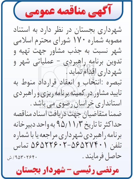 شهرداری بجستان در نظر دارد به استناد مصوبه شماره 170 شورای محترم اسلامی شهر نسبت به جذب مشاور جهت تهیه و تدوین برنامه راهبردی - عملیاتی شهر و شهرداری اقدام نماید .