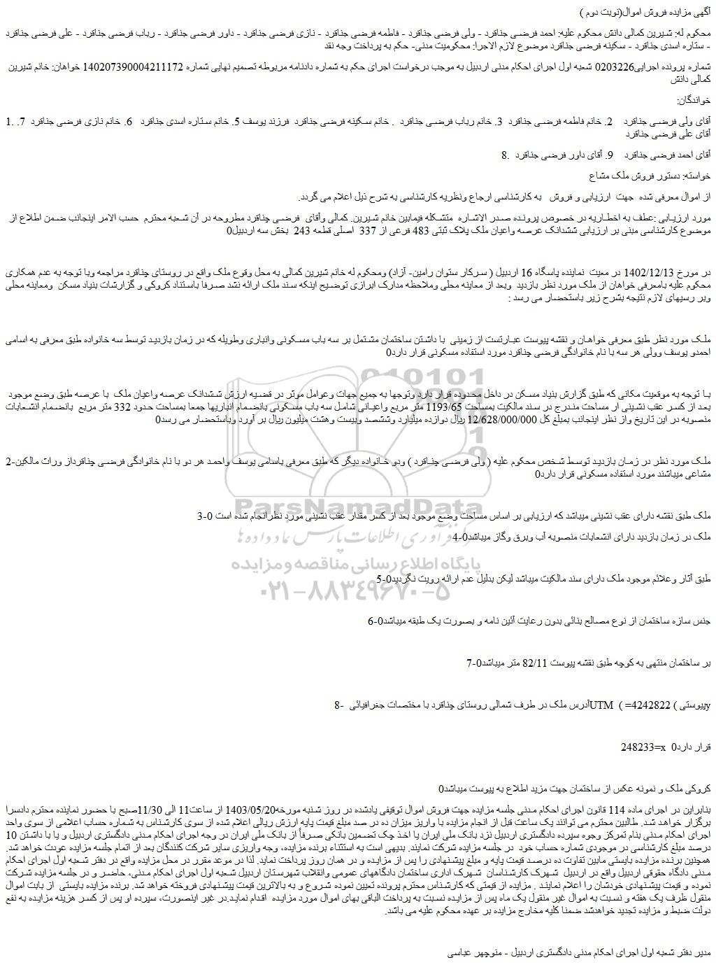 مورد ارزیابی :عطف به اخطاریه در خصوص پرونده صدر الاشاره  متشکله فیمابین خانم شیرین. کمالی وآقای  فرضی چناقرد مطروحه در آن شعبه محترم  حسب الامر اینجانب ضمن اطلاع از موضوع کارشناسی مبنی بر ارزیابی ششدانک عرصه واعیان ملک پلاک ثبتی 483 فرعی از 337  اصلی قطعه 243  بخش سه اردبیل0