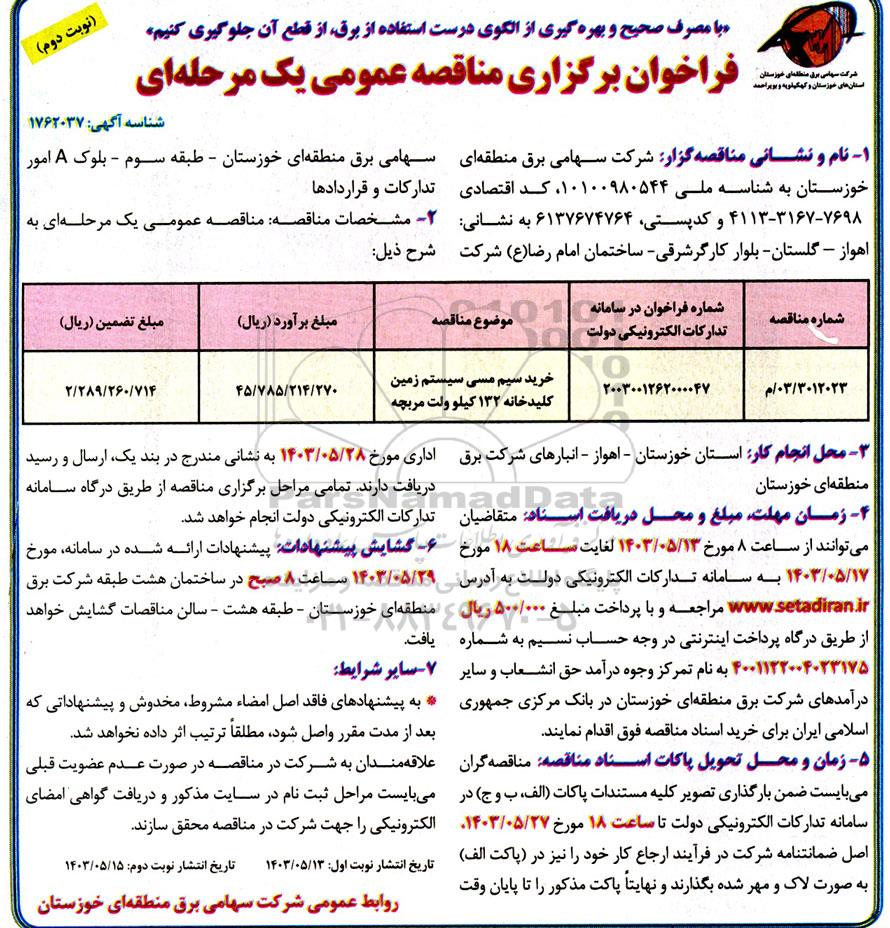 مناقصه خرید سیم مسی سیستم زمین کلیدخانه - نوبت دوم , مناقصه خرید سیم مسی سیستم زمین کلیدخانه - نوبت دوم
