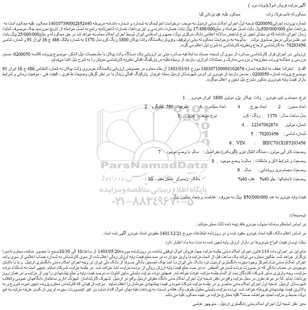 شماره پرونده اجرایی0200050 شعبه اول اجرای احکام مدنی اردبیل به موجب درخواست اجرایحکم به شماره و شماره دادنامه مربوطه 140107390002852440 محکوم علیه محکوم است به پرداخت مبلغ 500/000/000ریال بابت اصل خواسته و مبلغ17/498/000 ریال بابت خسارت دادرسی و نیز پرداخت خسارت تاخیرتادیه راجع به اصل خواسته از تاریخ سررسید چک موصوف لغایت زمان اجرای دادنامه که بر مبنای تغییر نرخ شاخص سالانه اعلامی بانک مرکزی دولت جمهوری اسلامی ایران توسط اجرای احکام محاسبه خواهد شد در حق محکوم له و مبلغ25/000/000 ریال بابت نیم عشردولتی درحق صندوق دولت. ،باتوجه به درخواست محکوم له مبنی برتوقیف وفروش یکدستگاه وانت پیکان 1800 رنگ کرم مدل 1370 به شماره پلاک 486 ج 16 ایران 91 و شماره شاسی 70203456 به کارشناسی ارجاع ونظریه کارشناسی به شرح ذیل اعلام می گردد.