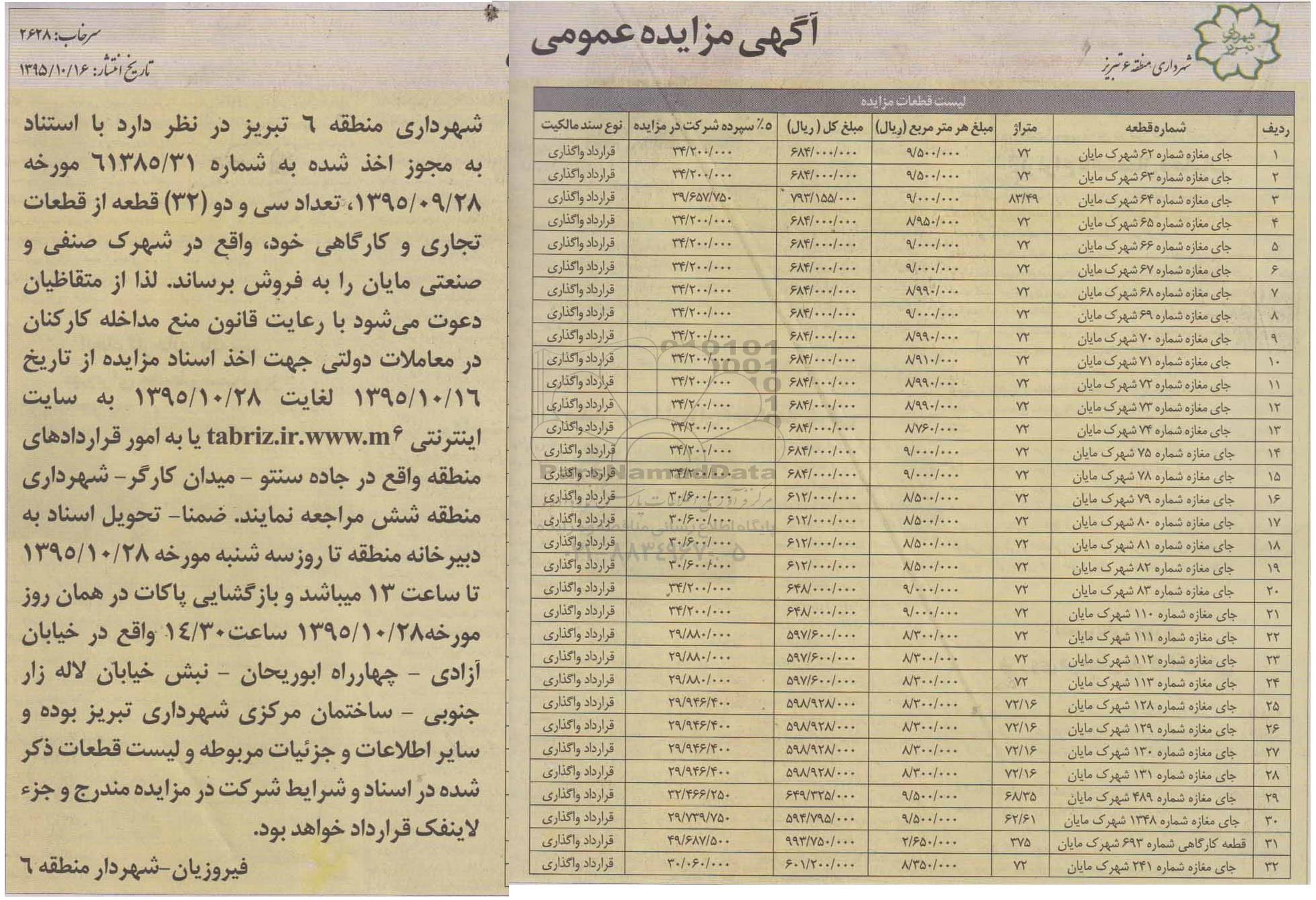 مزایده عمومی مزایده تعداد 32 قطعه از قطعات تجاری و کارگاهی برگزار میگردد. از کلیه افراد متخصص و شرکت‌های واجد شرایط دعوت به عمل می‌آید تا در این مزایده با کد خبرگزاری پارس نماد : 782067 شرکت نمایند تاریخ شروع مزایده : 1395/10/16 مهلت شرکت در مزایده: تا پایان روز 1395/10/28 مکان برگزاری اموال واگذاری استان‌های آذربایجان شرقی و دسته‌بندی‌های مربوط به این حراجی املاک و زمین میباشد.