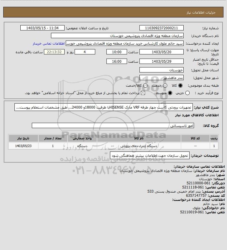 شرح کلی نیاز: تجهیزات برودتی کاست چهار طرفه VRF مارک HISENSEبا ظرفیت 18000و 24000... طبق مشخصات استعلام پیوست...