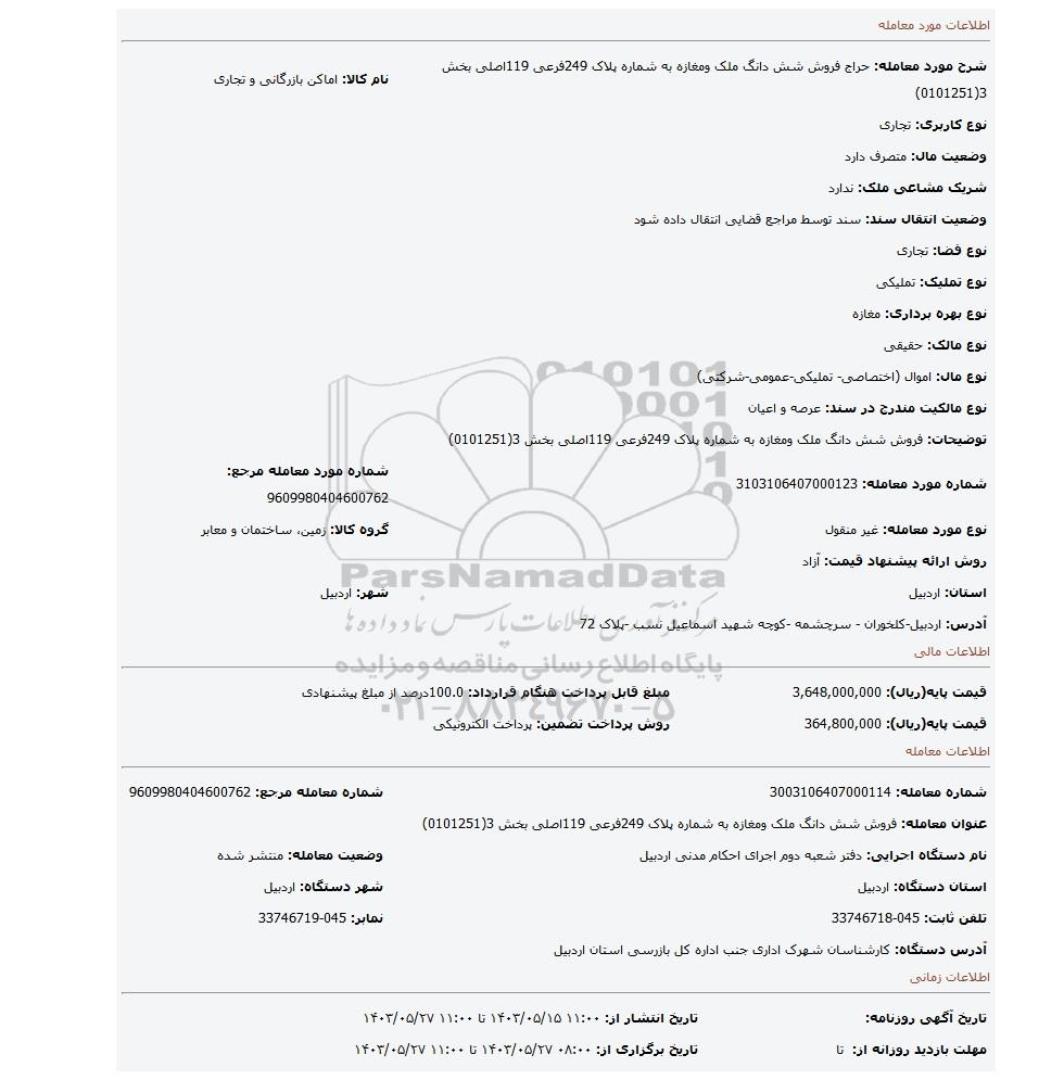 شرح مورد معامله: حراج فروش شش دانگ ملک ومغازه به شماره پلاک 249فرعی 119اصلی بخش 3(0101251) | نام کالا: اماکن بازرگانی و تجاری | |