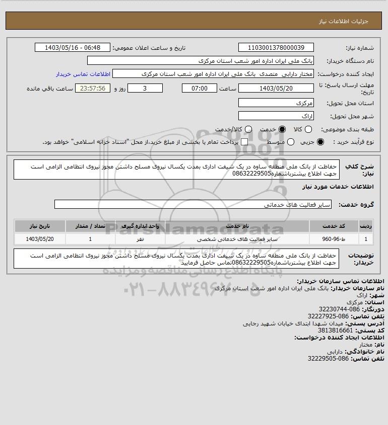 شرح کلی نیاز: حفاظت از بانک ملی منطقه ساوه در یک شیفت اداری بمدت یکسال نیروی مسلح داشتن مجوز نیروی انتظامی الزامی است جهت اطلاع بیشترباشماره08632229505