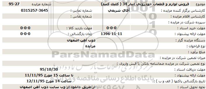 مزایده عمومی مزایده فروش لوازم و قطعات خودروئی انبار 34 برگزار میگردد. از کلیه افراد متخصص و شرکتهای واجد شرایط دعوت به عمل میآید تا در این مزایده با کد خبرگزاری پارس نماد : 782629 شرکت نمایند تاریخ شروع مزایده : 1395/10/19 مهلت شرکت در مزایده: تا پایان روز 1395/10/30 مکان برگزاری اموال واگذاری استانهای اصفهان و دستهبندیهای مربوط به این حراجی قطعات خودرو میباشد.