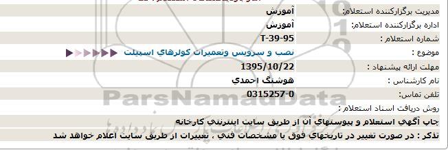 استعلام بها و موضوع استعلام استعلام ، استعلام نصب و سرویس و تعمیرات کولرهای اسپیلت به اطلاع کلیه شرکتها و افراد متخصص واجد شرایط میرساند، آگهی گذار در نظر دارد از طریق استعلام بها، نسبت به انتخاب و دریافت پیشنهادات اقدام نماید. این استعلام با کد آگهی ثبت شده در سامانه خبرگزاری پارس نماد : 782833 منتشر شده است. مشخصات استعلام : تاریخ شروع استعلام: 1395/10/19 آخرین مهلت ارسال پیشنهاد قیمت : 1395/10/22 و محل اجرای پروژه : استان اصفهان میباشد. استعلام قیمت مورد درخواست : استعلام ، استعلام نصب و سرویس و تعمیرات کولرهای اسپیلت با دستهبندیهای تخصصی و گروه های مرتبط : تاسیسات ساختمانی, صنایع حرارتی و برودتی, لوازم خانگی, استعلام اطلاع رسانی میگردد.