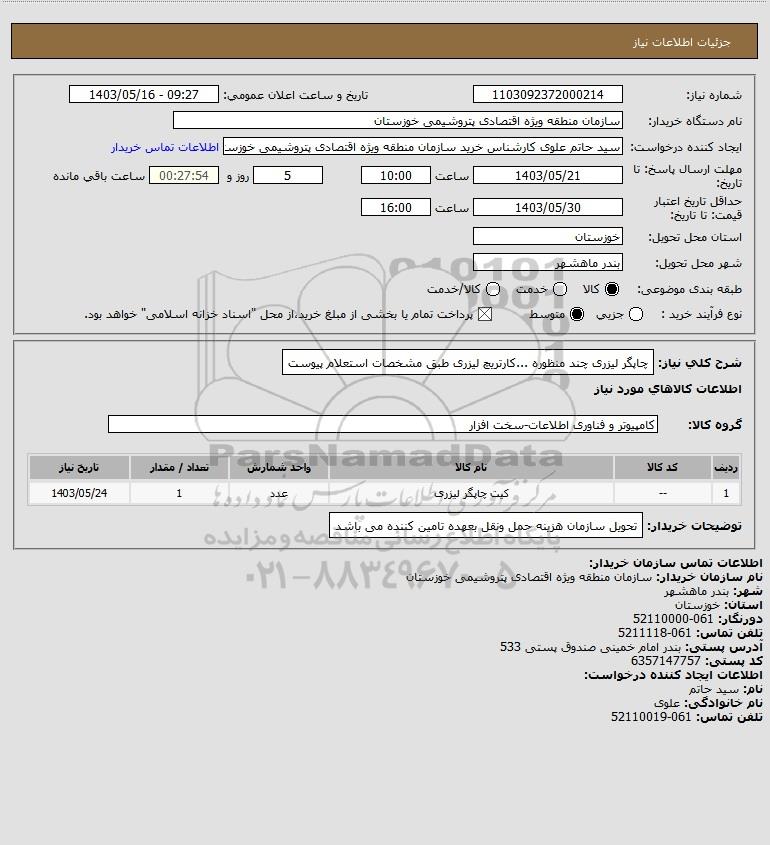 | 1 | -- | کیت چاپگر لیزری | عدد | 1 | 1403/05/24 |