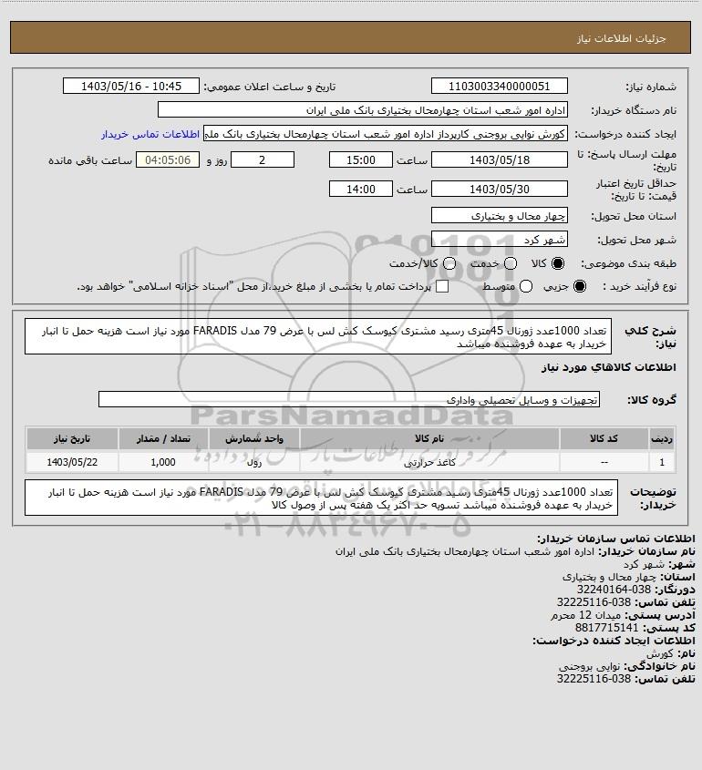 شرح کلی نیاز: تعداد 1000عدد ژورنال 45متری رسید مشتری کیوسک کش لس با عرض 79 مدل FARADIS مورد نیاز است هزینه حمل تا انبار خریدار به عهده فروشنده میباشد