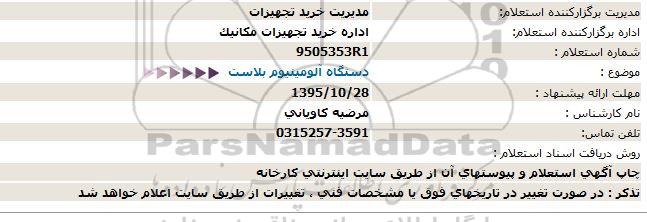استعلام بها و موضوع استعلام استعلام , استعلام دستگاه آلومینیوم بلاست به اطلاع کلیه شرکتها و افراد متخصص واجد شرایط میرساند، آگهی گذار در نظر دارد از طریق استعلام بها، نسبت به انتخاب و دریافت پیشنهادات اقدام نماید. این استعلام با کد آگهی ثبت شده در سامانه خبرگزاری پارس نماد : 783382 منتشر شده است. مشخصات استعلام : تاریخ شروع استعلام: 1395/10/20 آخرین مهلت ارسال پیشنهاد قیمت : 1395/10/28 و محل اجرای پروژه : استان اصفهان میباشد. استعلام قیمت مورد درخواست : استعلام , استعلام دستگاه آلومینیوم بلاست با دستهبندیهای تخصصی و گروه های مرتبط : تجهیزات و ماشین آلات صنعتی, استعلام اطلاع رسانی میگردد.