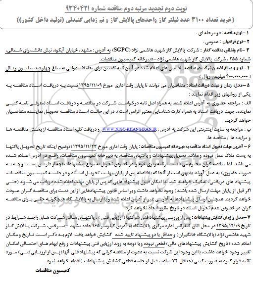 خرید تعداد 3100 عدد فیلتر گاز واحدهای پالایش گاز و نم زدایی گنبدلی (تولید داخل کشور)
