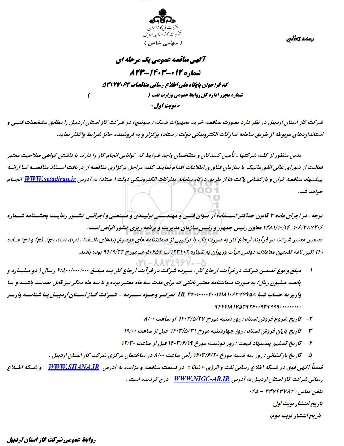 ضمناً آگهی فوق در شبكه اطلاع رسانی نفت و انرژی « شانا »  در قسمت مناقصه و مزايده به آدرس  WWW.SHANA.IR  و شبكه اطلاع رسانی شركت گاز استان اردبيل به آدرس WWW.NIGC-AR.IR درج گرديده است .