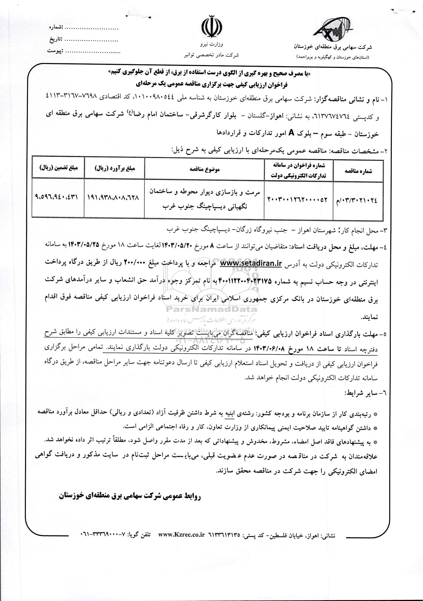 03/3021024/م | 2003001262000052 | مرمت و بازسازی دیوار محوطه و ساختمان نگهبانی دیسپاچینگ جنوب غرب |