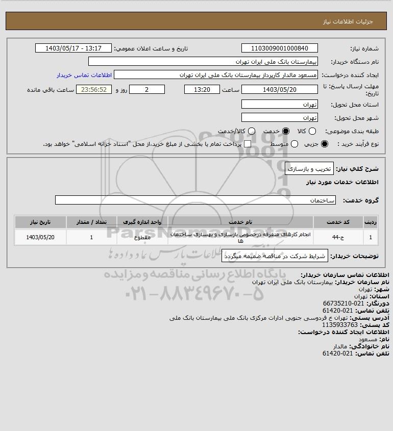 استعلام بها و موضوع استعلام استعلام تخریب و بازسازی به اطلاع کلیه شرکتها و افراد متخصص واجد شرایط میرساند، آگهی گذار در نظر دارد از طریق استعلام بها، نسبت به انتخاب و دریافت پیشنهادات اقدام نماید. این استعلام با کد آگهی ثبت شده در سامانه خبرگزاری پارس نماد : 7836039 منتشر شده است. مشخصات استعلام : تاریخ شروع استعلام: 1403/05/17 آخرین مهلت ارسال پیشنهاد قیمت : 1403/05/20 و محل اجرای پروژه : استان تهران میباشد. استعلام قیمت مورد درخواست : استعلام تخریب و بازسازی با دستهبندیهای تخصصی و گروه های مرتبط : ساختمان, استعلام اطلاع رسانی میگردد.