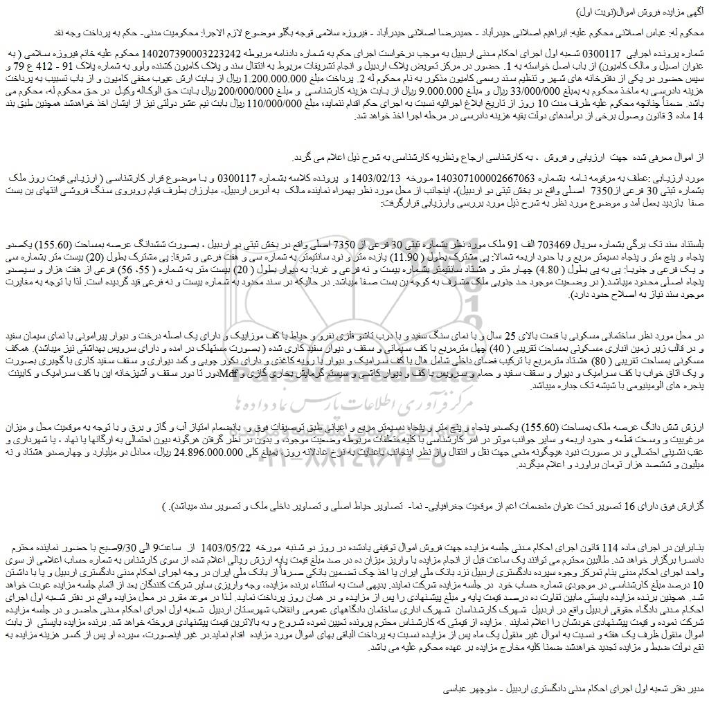 شماره پرونده اجرایی  0300117 شعبه اول اجرای احکام مدنی اردبیل به موجب درخواست اجرای حکم به شماره دادنامه مربوطه 140207390003223242 محکوم علیه خانم فیروزه سلامی ( به عنوان اصیل و مالک کامیون) از باب اصل خواسته به 1. حضور در مرکز تعویض پلاک اردبیل و انجام تشریفات مربوط به انتقال سند و پلاک کامیون کشنده ولوو به شماره پلاک 91 - 412 ع 79 و سپس حضور در یکی از دفترخانه های شهر و تنظیم سند رسمی کامیون مذکور به نام محکوم له 2. پرداخت مبلغ 1.200.000.000 ریال از بابت ارش عیوب مخفی کامیون و از باب تسبیب به پرداخت هزینه دادرسی به ماخذ محکوم به بمبلغ 33/000/000 ریال و مبلغ 9.000.000 ریال از بابت هزینه کارشناسی  و مبلغ 200/000/000 ریال بابت حق الوکاله وکیل  در حق محکوم له، محکوم می باشد. ضمناً چنانچه محکوم علیه ظرف مدت 10 روز از تاریخ ابلاغ اجرائیه نسبت به اجرای حکم اقدام ننماید؛ مبلغ 110/000/000 ریال بابت نیم عشر دولتی نیز از ایشان اخذ خواهدشد همچنین طبق بند 14 ماده 3 قانون وصول برخی از درآمدهای دولت بقیه هزینه دادرسی در مرحله اجرا اخذ خواهد شد.