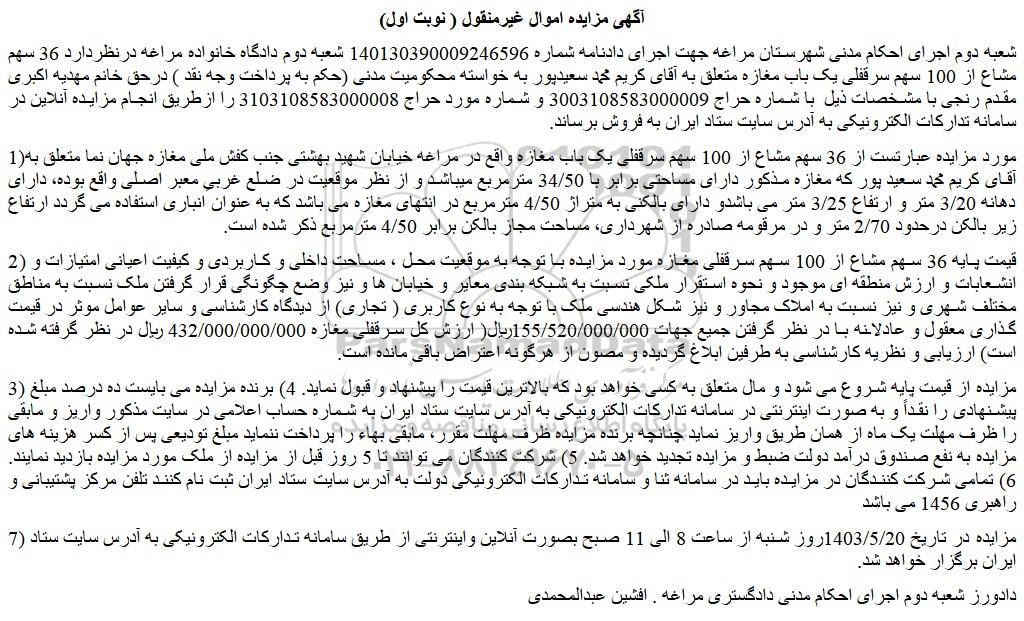 شعبه دوم اجرای احکام مدنی شهرستان مراغه جهت اجرای دادنامه شماره 140130390009246596 شعبه دوم دادگاه خانواده مراغه درنظردارد 36 سهم مشاع از 100 سهم سرقفلی یک باب مغازه متعلق به آقای کریم محمد سعیدپور به خواسته محکومیت مدنی (حکم به پرداخت وجه نقد ) درحق خانم مهدیه اکبری مقدم رنجی با مشخصات ذیل  با شماره حراج 3003108583000009 و شماره مورد حراج 3103108583000008 را ازطریق انجام مزایده آنلاین در سامانه تدارکات الکترونیکی به آدرس سایت ستاد ایران به فروش برساند.