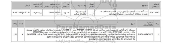| 52472612 | دستگاه تست گازکارماتوگرافی ترانس مدل : calisto 9 به همرات متعلقات استاندارد و آپشنهای مورد نیاز | 1 | خرید تجهیزات وقطعات یدکی | کشوری | 1403/05/25 | بیژن نظری | B.NAZARI@KSC.IR |