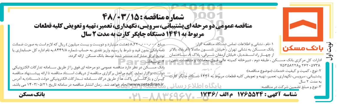 مناقصه پشتیبانی، سرویس،نگهداری و تعمیر،تهیه و تعویض  کلیه قطعات مربوط به 1441 دستگاه چاپگر کارت, مناقصه پشتیبانی، سرویس،نگهداری و تعمیر،تهیه و تعویض  کلیه قطعات مربوط به 1441 دستگاه چاپگر کارت