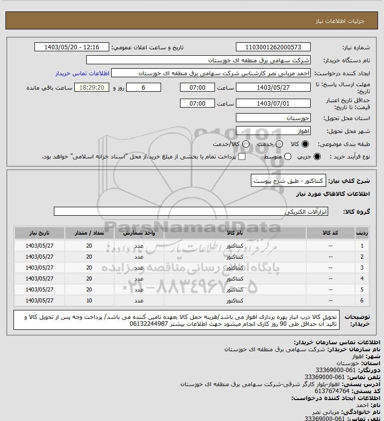 شرح کلی نیاز: کنتاکتور - طبق شرح پیوست