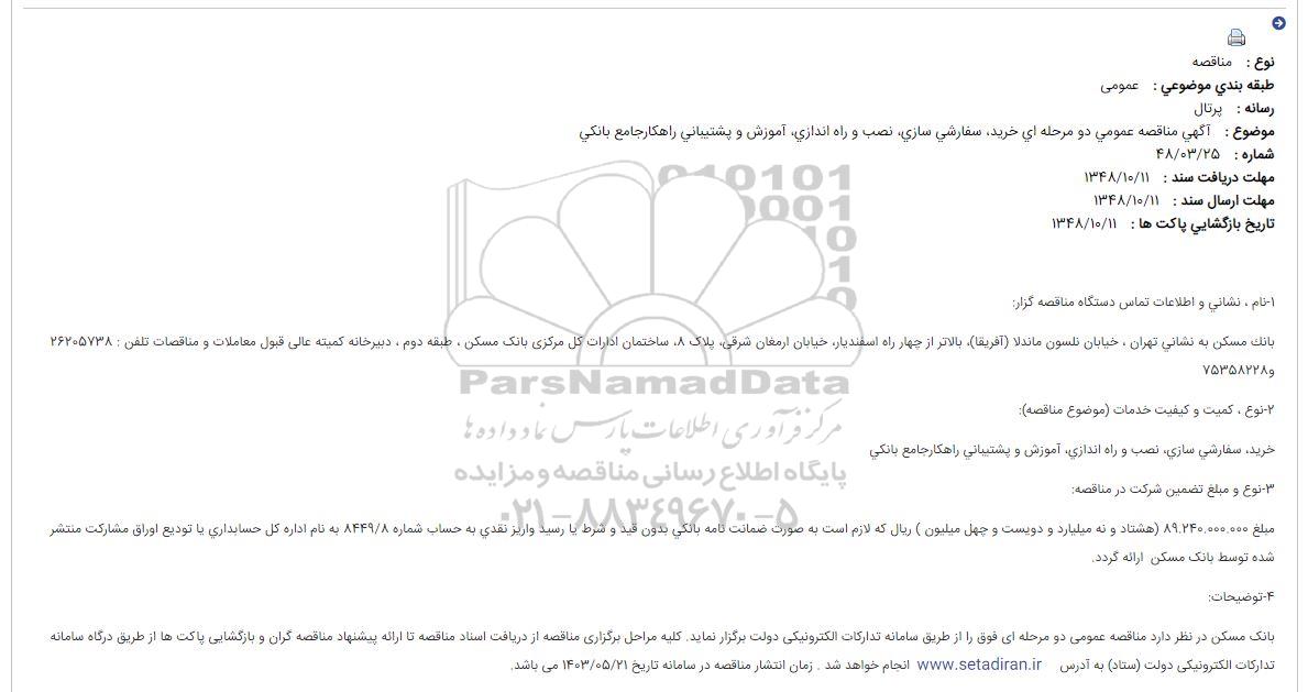 موضوع: اگهی مناقصه عمومی دو مرحله ای خرید، سفارشی سازی، نصب و راه اندازی، آموزش و پشتیبانی راهکار جامع بانکی