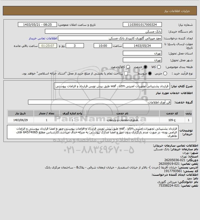 شرح کلی نیاز: قرارداد پشتیبانی تجهیزات امنیتی waf ، utm طبق پیش نویس قرارداد و الزامات پیوستی