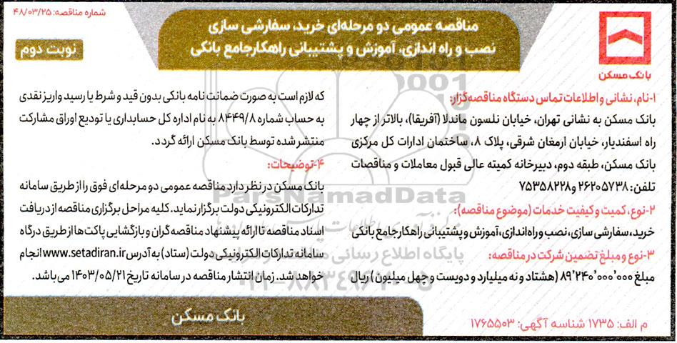 مناقصه عمومی دو مرحله ای خرید، سفارشی سازی، نصب و راه اندازی، آموزش و پشتیبانی راهکار جامع بانکی شماره 48/03/25 نوبت دوم