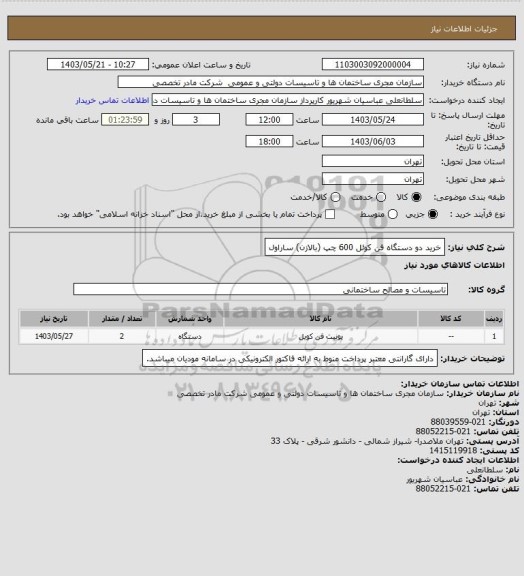 شرح کلی نیاز: خرید دو دستگاه فن کوئل 600 چپ (بالازن) ساراول