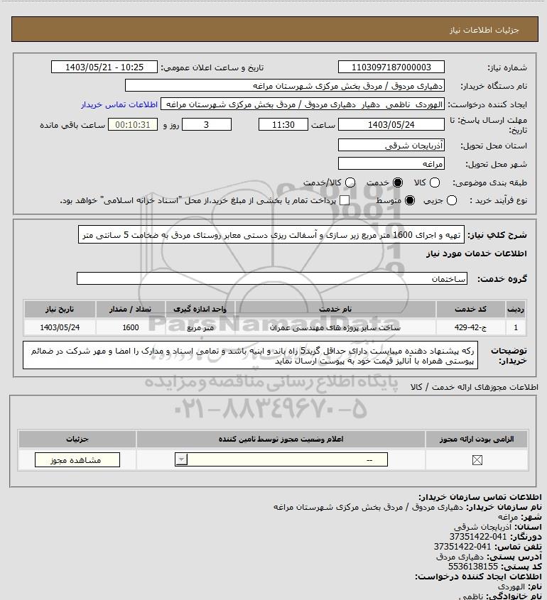 شرح کلی نیاز: تهیه و اجرای 1600 متر مربع زیر سازی و آسفالت ریزی دستی معابر روستای مردق به ضخامت 5 سانتی متر