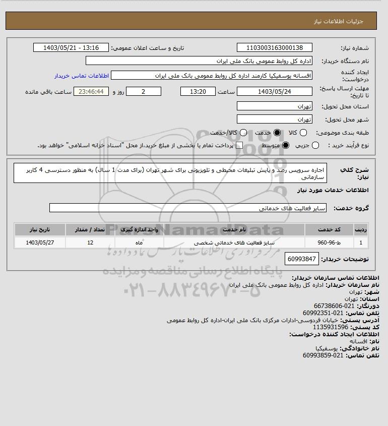 شرح کلی نیاز: اجاره سرویس رصد و پایش تبلیغات محیطی و تلویزیونی برای شهر تهران (برای مدت 1 سال) به منظور دسترسی 4 کاربر سازمانی