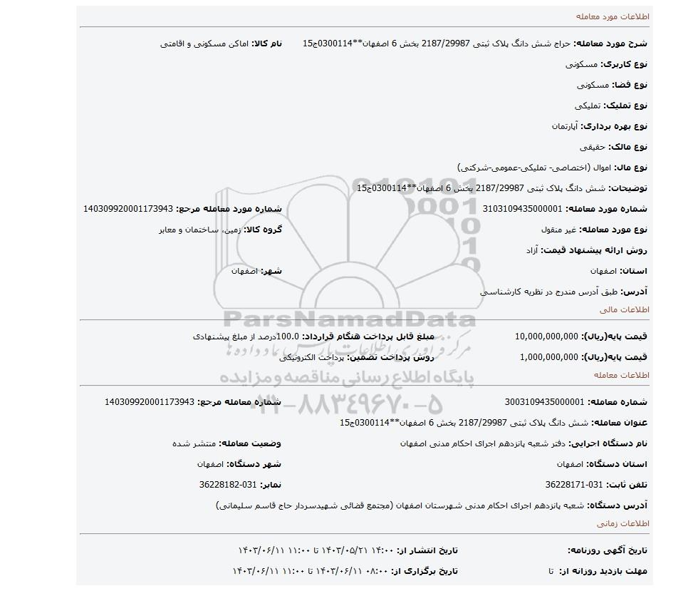 | شرح مورد معامله: حراج شش دانگ پلاک ثبتی 2187/29987 بخش 6 اصفهان**0300114ج15 | نام کالا: اماکن مسکونی و اقامتی | |