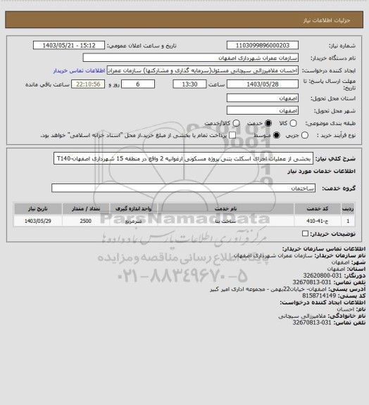 شرح کلی نیاز: بخشی از عملیات اجرای اسکلت بتنی پروژه مسکونی ارغوانیه 2 واقع در منطقه 15 شهرداری اصفهان-T140