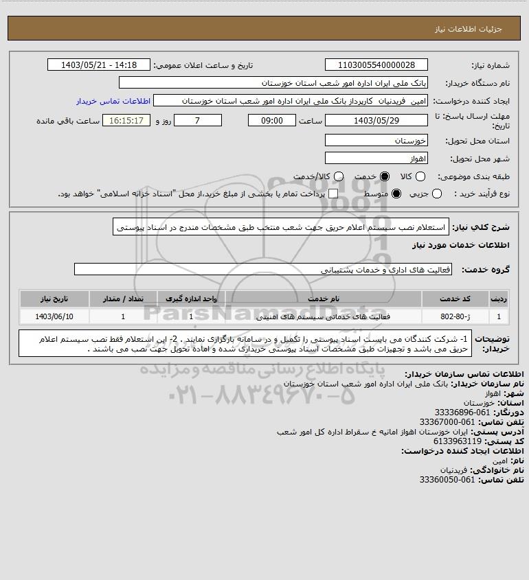 نام دستگاه خریدار:بانک ملی ایران اداره امور شعب استان خوزستان
