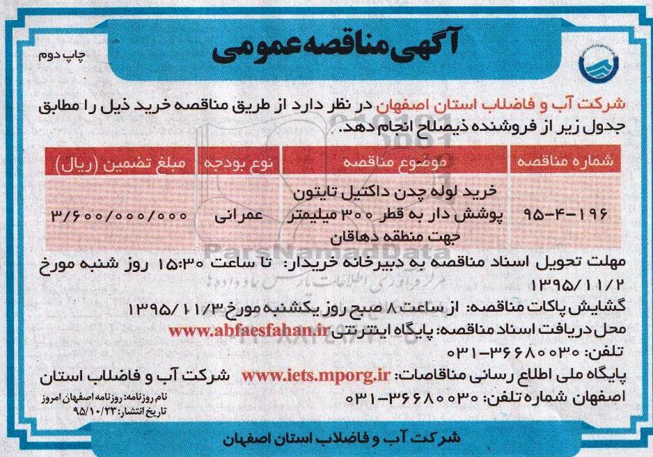 | 95-4-196 | خرید لوله چدن داکتیل تایتون پوشش دار به قطر 300 میلیمتر جهت منطقه دهاقان |