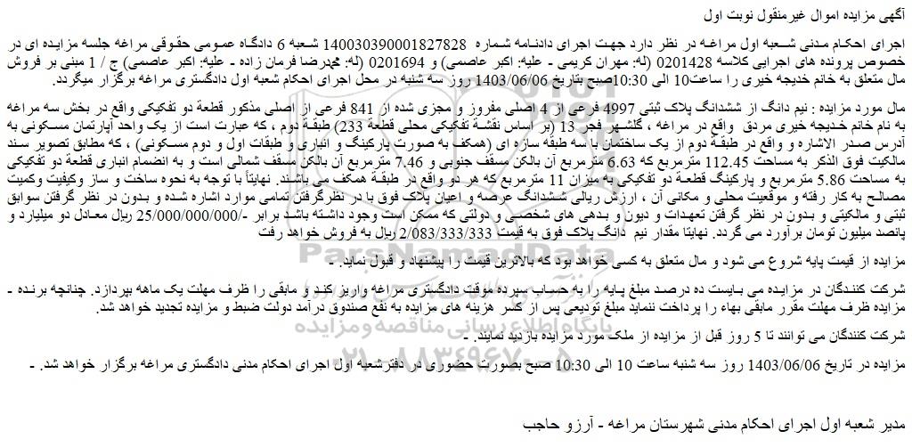 اجرای احکام مدنی شعبه اول مراغه در نظر دارد جهت اجرای دادنامه شماره 140030390001827828 شعبه 6 دادگاه عمومی حقوقی مراغه جلسه مزایده ای در خصوص پرونده های اجرایی کلاسه 0201428 (له: مهران کریمی - علیه: اکبر عاصمی) و 0201694 (له: محمدرضا فرمان زاده - علیه: اکبر عاصمی) ج / 1 مبنی بر فروش مال متعلق به خانم خدیجه خیری را ساعت10 الی 10:30صبح بتاریخ 1403/06/06 روز سه شنبه در محل اجرای احکام شعبه اول دادگستری مراغه برگزار میگردد.