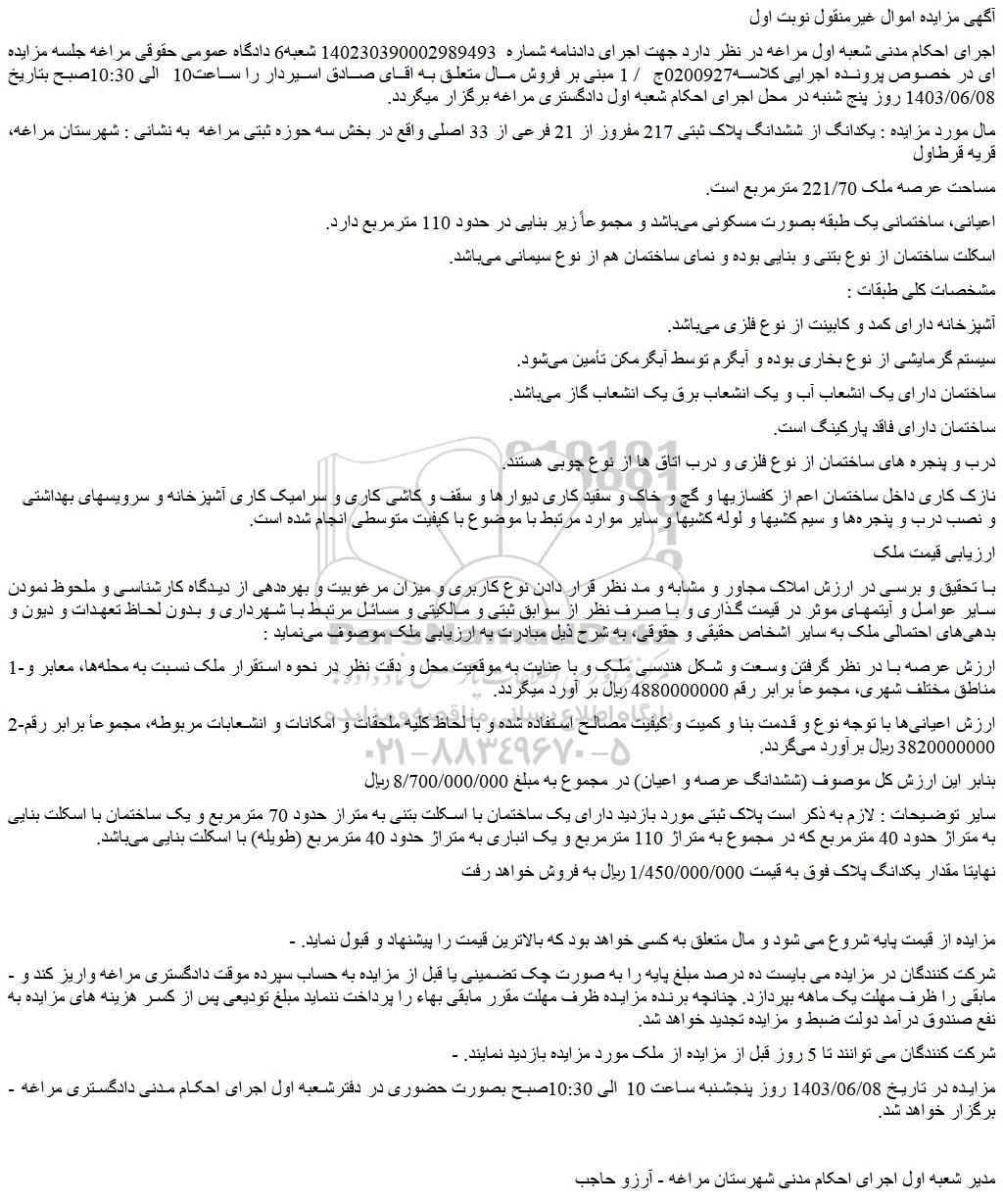 - مزایده در تاریخ 1403/06/08 روز پنجشنبه ساعت 10 الی 10:30صبح بصورت حضوری در دفترشعبه اول اجرای احکام مدنی دادگستری مراغه برگزار خواهد شد