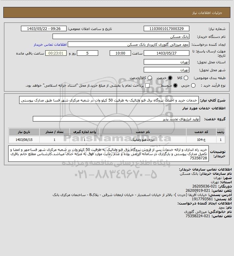 شرح کلی نیاز: خدمات خرید و احداث نیروگاه برق فتو ولتائیک به ظرفیت 50 کیلو وات در شعبه مرکزی شهر فسا طبق مدارک پیوستی