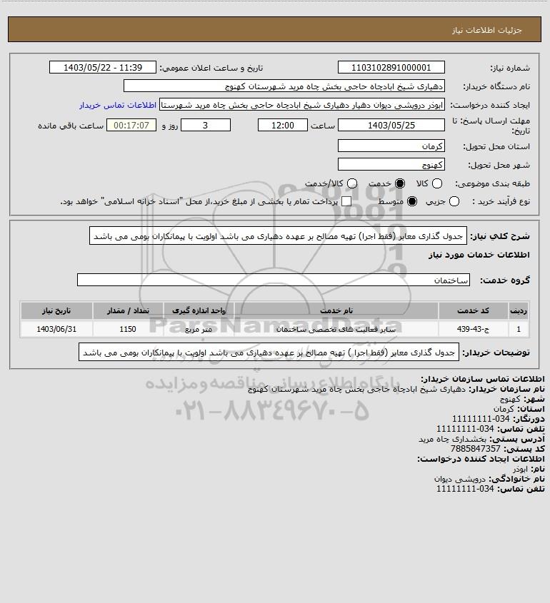 شرح کلی نیاز: جدول گذاری معابر (فقط اجرا) تهیه مصالح بر عهده دهیاری می باشد اولویت با پیمانکاران بومی می باشد