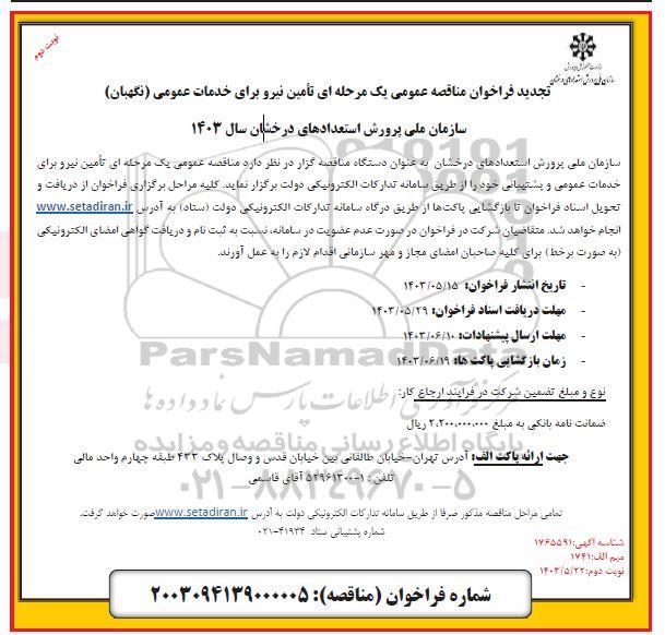 مناقصه تامین نیرو برای خدمات عمومی (نگهبان) تجدید - نوبت دوم از کلیه افراد متخصص و شرکتها واجد شرایط دعوت به عمل میآید در مناقصه با کد خبرگزاری پارس نماد: 7858497 شرکت نمایند.